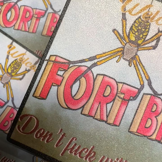 Welcome Fort Bragg (Liberty) home of the 82nd Airborne! Depicted are the protected Red-cockaded woodpecker and Banana Spiders which can be found between trees waiting for you to run into them at unsuspecting moments.